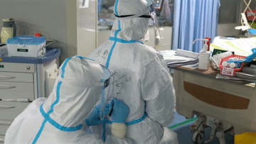 穿上隔離服的醫(yī)護(hù)人員只能露出一雙眼睛,誰(shuí)也認(rèn)不出對(duì)方,于是他們進(jìn)入隔離區(qū)的第一件事,就是相互在隔離服上寫下對(duì)方的名字或者外號(hào),有時(shí)還會(huì)藝術(shù)創(chuàng)作一下,這成了隔離病房里“神秘的儀式”。