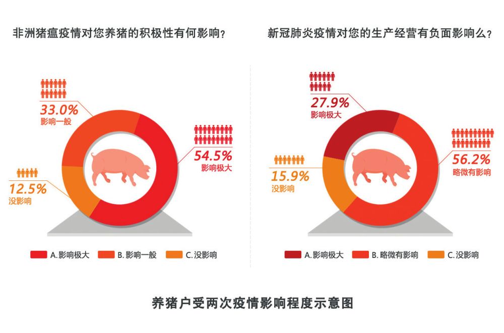 調查顯示,54.5%的養(yǎng)豬戶認為非洲豬瘟疫情對養(yǎng)豬的積極性影響極大,防護成本高、造成虧損、仔豬成本高,是養(yǎng)豬戶反映非洲豬瘟疫情帶來的最強烈影響,27.9%的養(yǎng)豬戶認為新冠肺炎疫情對生產經營的負面影響極大。(見圖1)