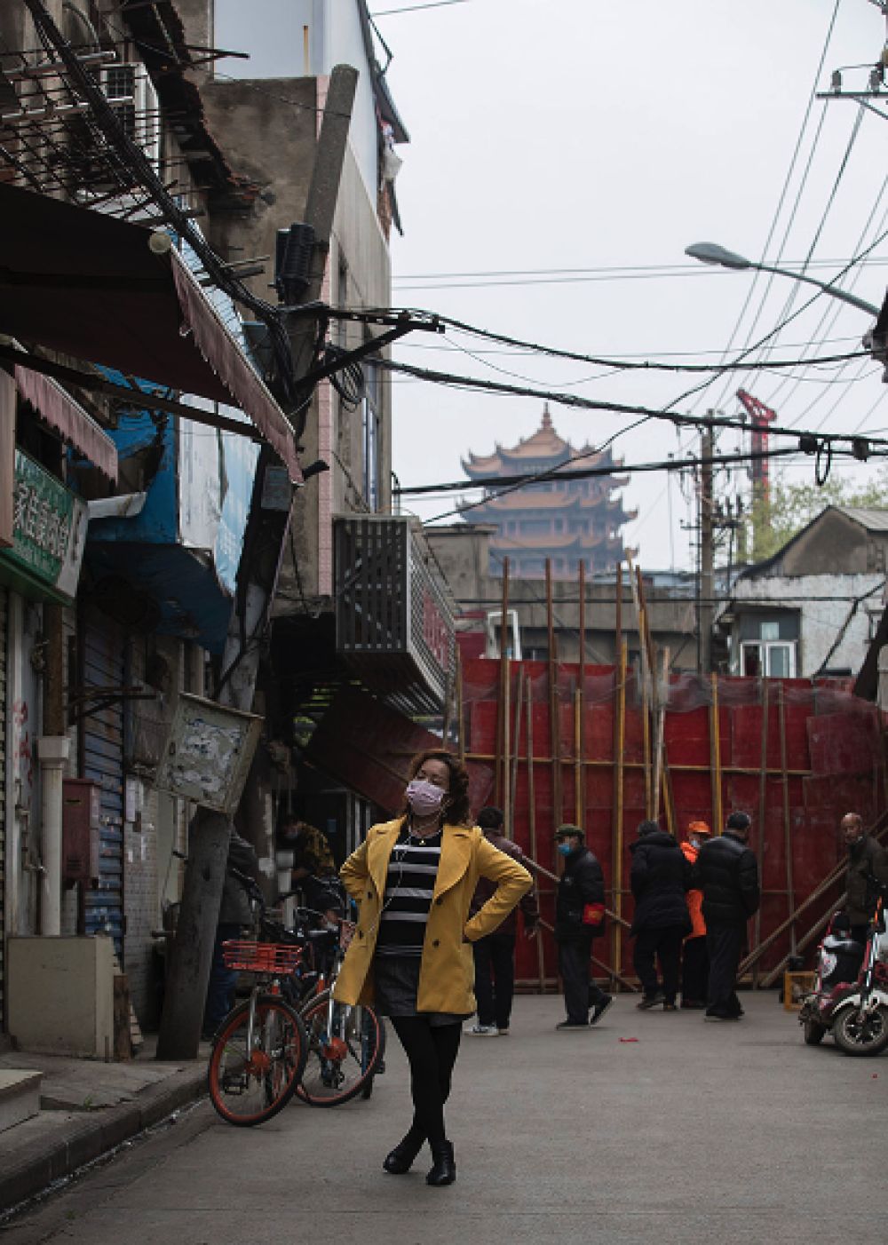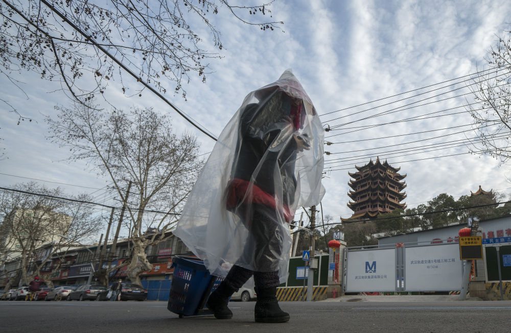 ↑3月15日,一位身穿自制“防護(hù)服”的女士上街買菜時(shí)從黃鶴樓下走過。她說她近兩個(gè)月來,只出過兩次門。