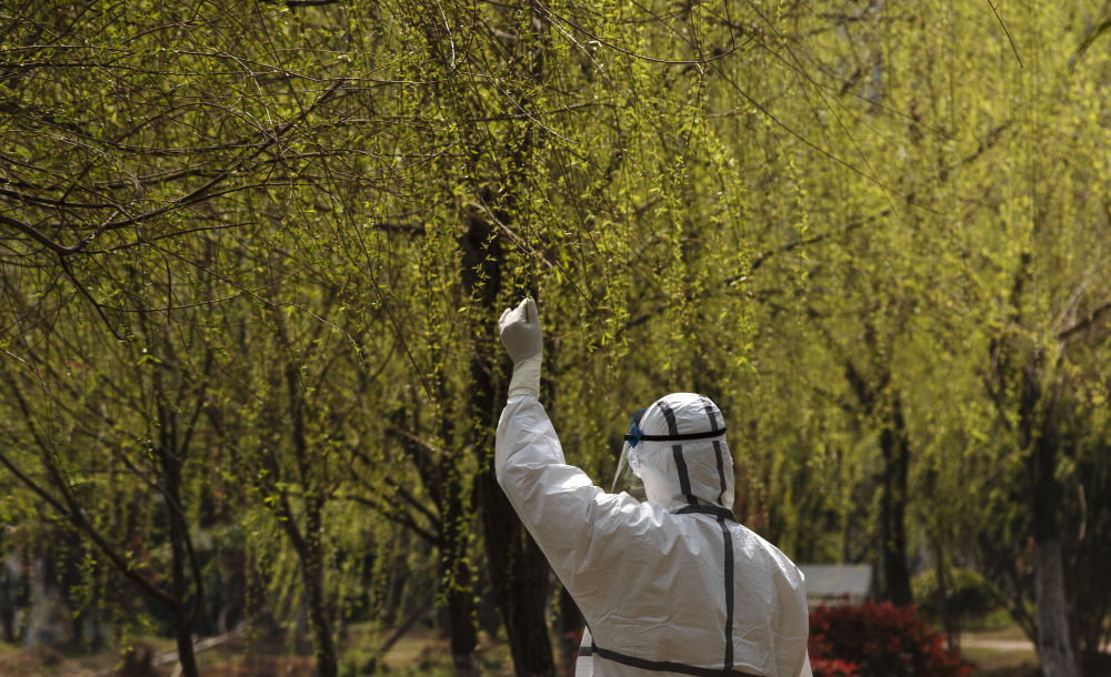 ↑3月14日,在華中科技大學(xué)同濟(jì)醫(yī)學(xué)院附屬同濟(jì)醫(yī)院光谷院區(qū),負(fù)責(zé)新冠病毒肺炎患者轉(zhuǎn)運(yùn)的云南醫(yī)療隊(duì)隊(duì)員姚紅軍伸手觸摸剛剛發(fā)芽的柳枝。