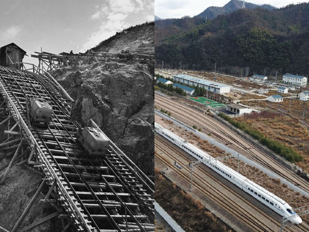 ?。ㄗ髨D:1957年金寨響洪甸水庫(kù)工地上吊車運(yùn)送混凝土,新華社稿王永嘉攝;右圖:2019年高鐵駛出金寨火車站。新華社記者張端攝)