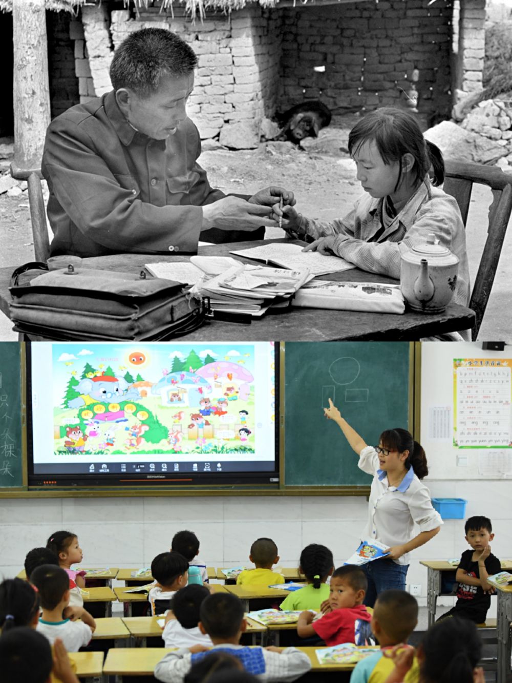 (上圖:1991年5月,金寨縣希望小學(xué)老師胡遵訓(xùn)跑20多里山路為學(xué)生胡亞麗補(bǔ)課,新華社記者張曙光攝;下圖:2019年9月3日,金寨縣希望小學(xué)南校區(qū)學(xué)生通過多媒體上課。新華社記者劉軍喜攝)