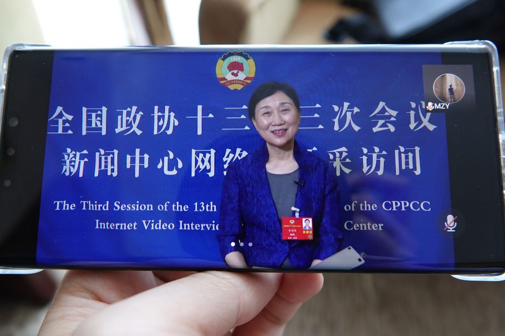 20日,記者通過手機(jī)觀看全國政協(xié)委員接受采訪。