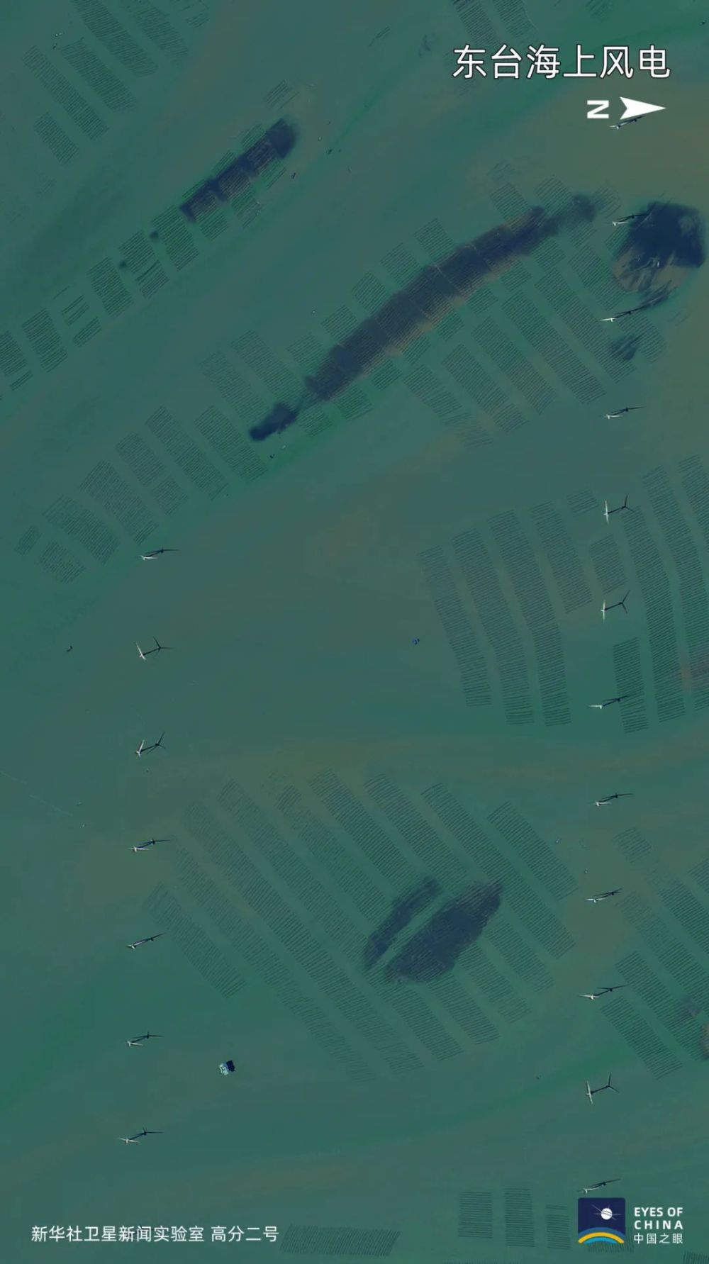江蘇東臺,漁排間的海上風(fēng)電機(jī)星星點點。2019年中國可再生能源發(fā)電總裝機(jī)容量達(dá)到7.94億千瓦,占全部電力裝機(jī)的39.5%。