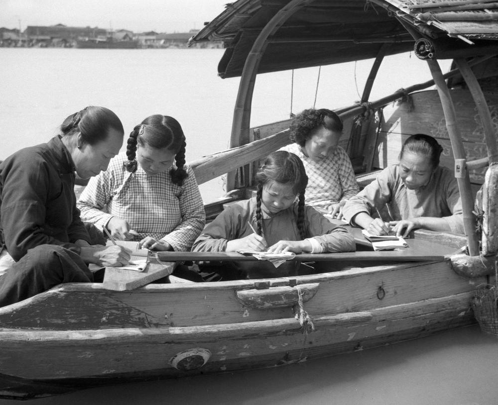 ↑ 1958年,福建省福州市生活在水上的婦女在船頭練習(xí)寫字。解放前,福州市的水上居民中婦女100%都是文盲。解放后,她們走進(jìn)了識(shí)字班,在當(dāng)?shù)匦W(xué)教師的輔導(dǎo)下開展掃盲學(xué)習(xí)。