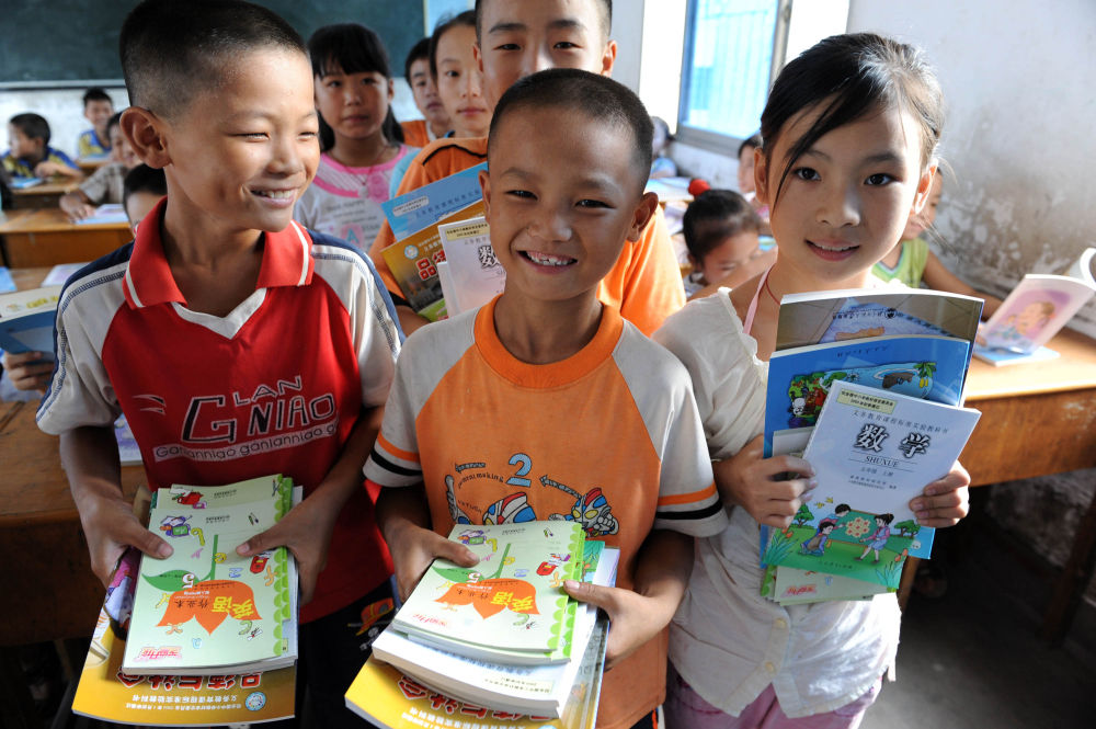 ↑ 這是2008年9月1日,江西樟樹市第二小學(xué)五(1)班鄧文?。ㄖ校┑韧瑢W(xué)領(lǐng)到免費(fèi)教科書。