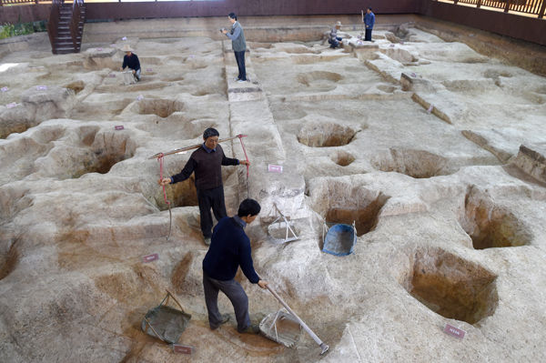 上山考古遺址公園內發(fā)掘原址上的考古現場情景再現。韓傳號?攝