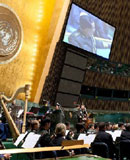 國東部時間5月20日下午,紐約曼哈頓,聯(lián)合國總部大會廳。一場中美軍樂團(tuán)聯(lián)合音樂會隆重舉行。首次走進(jìn)聯(lián)合國的中國人民解放軍軍樂團(tuán),演奏了《歌唱祖國》為音樂會“壓軸”。激昂的樂曲在這里回蕩,難忘的歷史在這里流淌……