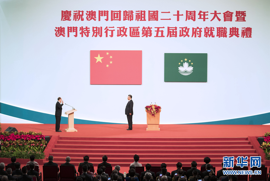 12月20日,慶祝澳門回歸祖國20周年大會暨澳門特別行政區(qū)第五屆政府就職典禮在澳門東亞運(yùn)動(dòng)會體育館隆重舉行。中共中央總書記、國家主席、中央軍委主席習(xí)近平出席并發(fā)表重要講話。這是習(xí)近平監(jiān)誓,澳門特別行政區(qū)第五任行政長官賀一誠宣誓就職。 新華社記者 黃敬文 攝