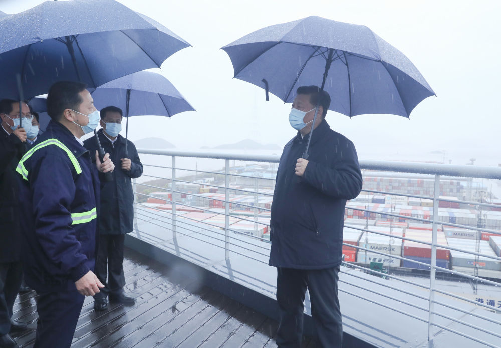 從新華社發(fā)出的現(xiàn)場照片看,總書記在寧波舟山港穿山港區(qū)碼頭上沒有佩戴口罩?!?