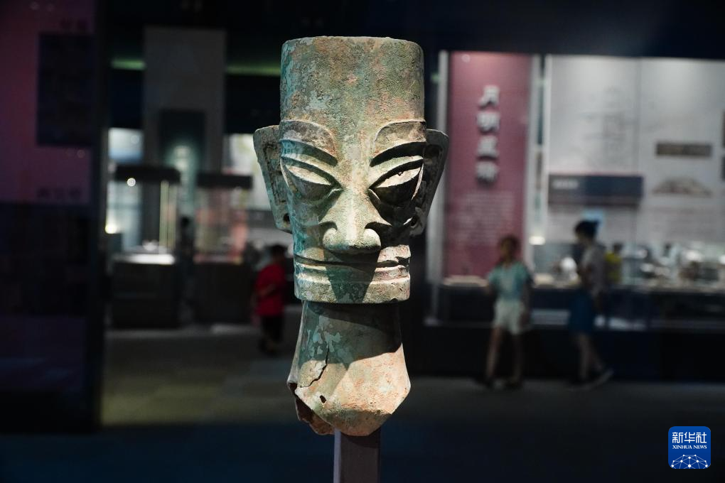 成果展上展出的四川省文物考古研究院藏四川广汉三星堆遗址出土铜人头像(7月12日摄)。