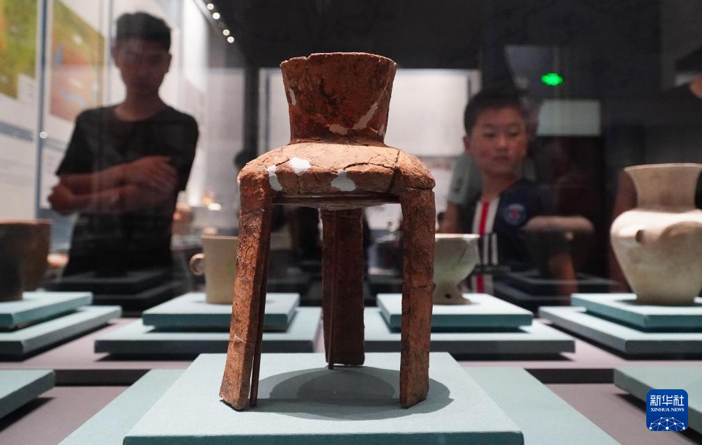 成果展上展出的山东省文物考古研究院藏龙山时代陶鼎(7月12日摄)。