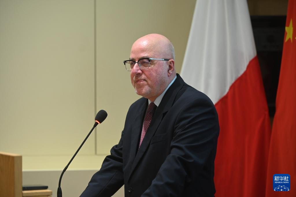 3月15日,在马耳他瓦莱塔,马耳他国家遗产、艺术和地方政府部长邦尼奇在马耳他艺术双年展中国馆开幕式上致辞。