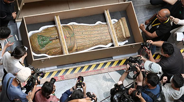 6月17日,在上海博物馆人民广场馆,萨卡拉考古遗址的彩绘人形棺开箱亮相。