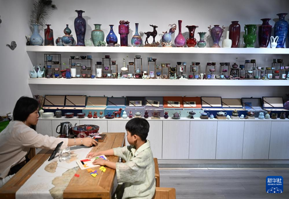 这是在河南省禹州市神垕镇拍摄的一家钧瓷店铺(7月3日摄)。