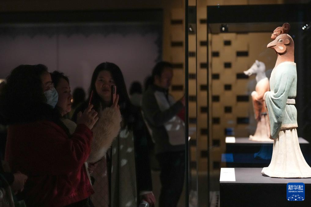 1月21日,观众在“聚宝之盆——新疆文物珍品展”观赏黑人百戏俑。