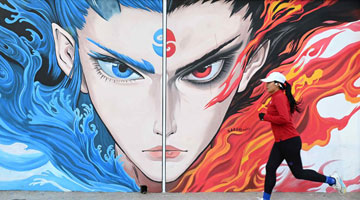 王彪的徒弟在给影人“张飞”的头部上色(2月19日摄)。