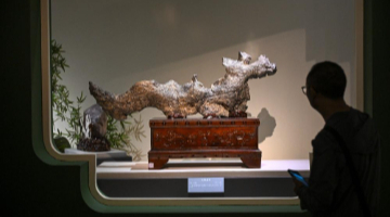 5月17日,游客在船山钟表博物馆内观看18世纪英国为中国清朝宫廷设计制作的“九耀金钟”。