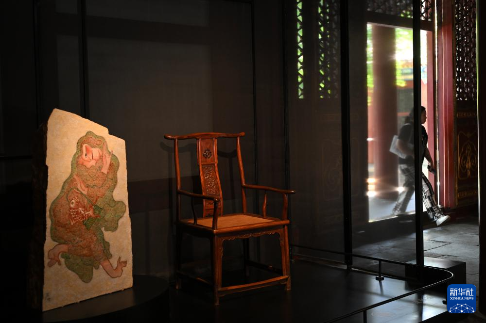 这是展出的黄花梨攒靠背禅椅与陶瓷作品《鱼篮观音》(5月19日摄)。