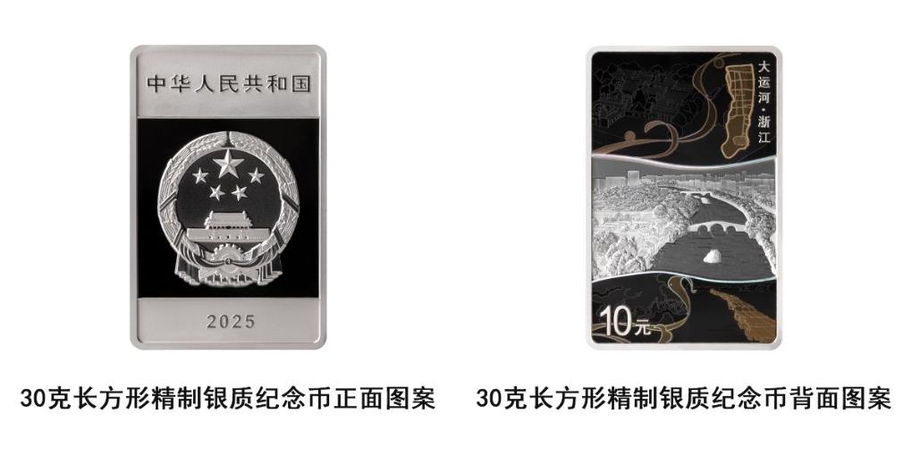 30克长方形银质纪念币背面图案以浙江杭州拱宸桥及历史文化街区为主要场景,衬以绍兴古纤道、宁波庆安会馆、南宋临安城平面图、浙东运河古地图等,并刊“大运河·浙江”字样及面额。