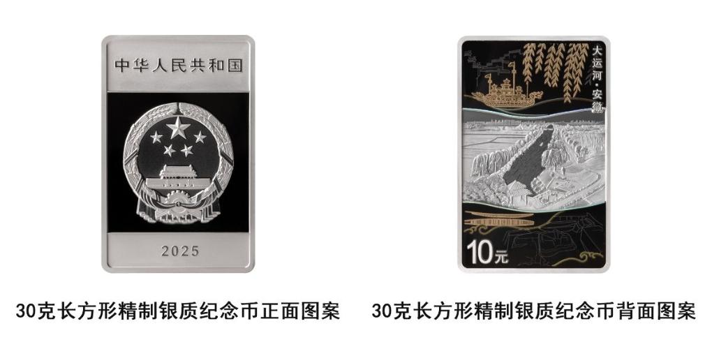 30克长方形银质纪念币背面图案以安徽通济渠泗县段为主要场景,衬以徽派建筑、龙舟、柳枝、柳孜运河遗址、出土古船复原图等,并刊“大运河·安徽”字样及面额。