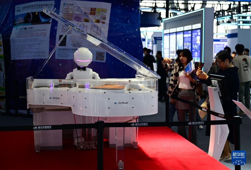 4月26日,观众在第三届中国(安徽)科技创新成果转化交易会上观赏一款弹钢琴的机器人。