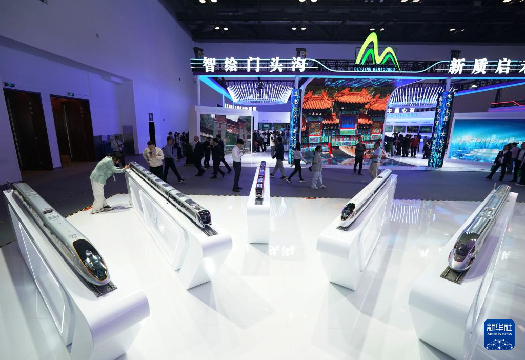 5月8日,观众在第二十七届中国北京国际科技产业博览会参观展出的动车组模型。