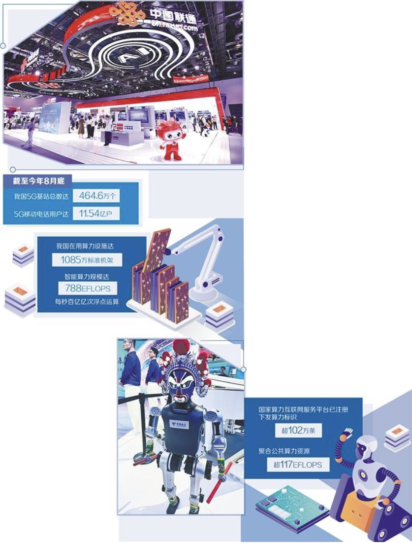 最新数据显示,截至今年8月底,我国5G基站总数达464.6万个,5G移动电话用户达11.54亿户,我国在5G用户普及率、千兆光网覆盖率等关键指标上继续领先全球;人工智能创新活跃,培育并开源的人工智能大模型已快速应用于电子、原材料、消费品等行业;5G应用融入86个国民经济大类,正加速向生产核心环节延伸。