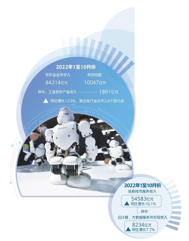 工信部日前公布数据显示,2022年1至10月份,我国软件和信息技术服务业(以下简称软件业)业务收入84214亿元,同比增长10%,增速较前三季度提高0.2个百分点;软件业利润总额10047亿元,同比增长4.5%,增速较前三季度提高1.8个百分点,呈现出平稳向好的运行态势。从细分数据看,我国工业软件产品和信息技术服务收入保持较快增长,中部地区增势领先。