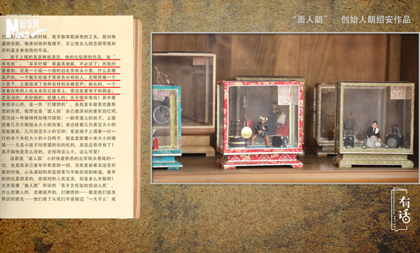 冰心先生的《小桔燈》散文集中,有一篇叫作《“面人郎”訪問記》的文章:“架子上擺的真是琳瑯滿目,他的比較新的作品,如“雞毛信”,“采茶撲蝶”等逼真細(xì)膩,不必說了;而我所最愛的,還是一小組一小組的舊北京街頭小景,什么賣糖葫蘆的,一個(gè)戴灰呢帽子穿黑色長袍的人,左臂挎著一個(gè)小籃子,上面插滿了各種各樣的冰糖葫蘆;剃頭的,一個(gè)披著白布的人低頭坐在紅板凳上,旁邊放著架子和銅盆;賣茶湯的;賣砂鍋的;吹糖人的;無不惟妙惟肖!”在文章當(dāng)中,冰心先生也提到了,最令她心動的是一個(gè)打糖鑼的,這是她童年最喜歡、最熟悉的東西,她認(rèn)為這也是“面人郎”最深刻的童年回憶。