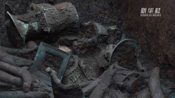 此次新發(fā)現(xiàn)的6個(gè)坑狀祭祀遺跡在第1、2號祭祀坑旁。面積僅3.5平方米的5號祭祀坑內(nèi)一片金光閃閃,已清理出多件金器、玉質(zhì)管珠和象牙飾品等。正在發(fā)掘的3號祭祀坑每天都有新發(fā)現(xiàn),6號祭祀坑確認(rèn)一具“木匣”,長約1.5米、寬約0.4米,木匣內(nèi)外均涂抹朱砂,目前尚不能確認(rèn)其用途。