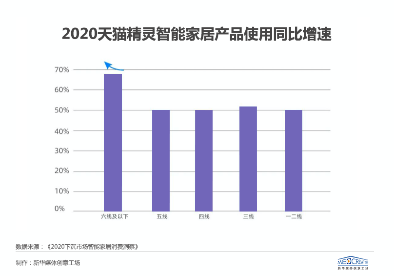 根據(jù)《2020下沉市場智能家居消費(fèi)洞察》顯示,50%以上的天貓精靈智能家居使用者在三到六線城市,其中六線城市用戶增速最快,四線城市銷量、銷售額增長最快,下沉市場正在成為智能家居行業(yè)的新藍(lán)海。同時,根據(jù)天貓平臺數(shù)據(jù)顯示,智能開關(guān)、智能落地?zé)?、智能電蒸箱等價格在50元到300元之間的小家電,在下沉市場年銷量同比增速均超過300%,也側(cè)面佐證著這一現(xiàn)象。