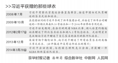????作為足球迷,能夠收獲著名球隊(duì)、球員的足球和球衣,恐怕是最讓別人羨慕的事兒了。習(xí)近平就曾經(jīng)收到球星貝克漢姆簽名的球衣、德甲勒沃庫森隊(duì)球衣、2006年世界杯專用足球等,也包括中國女子足球隊(duì)隊(duì)員簽名的足球。