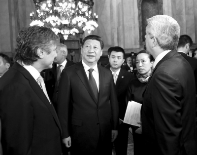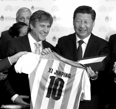 ????在和阿根廷副總統(tǒng)兼參議長布杜及眾議長多明格斯舉行會(huì)談時(shí),習(xí)近平特別提到阿根廷足球隊(duì)在世界杯奪得亞軍,他說:“剛才眾議長先生問我是否喜歡足球,我說我非常喜歡足球。他也祝愿中國能夠早日舉辦一屆世界杯,這正是我的愿望。但是我們足球的發(fā)展,還希望同阿根廷加強(qiáng)交流合作,靠你們的幫助,提高我們的水平。”
