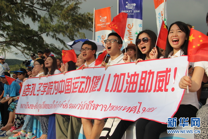 ??? 11月16日,普吉孔子學(xué)院的中國志愿者老師們?yōu)橹袊\動健兒加油。中國體育代表團16日在泰國普吉舉行的第四屆亞洲沙灘運動會上勇奪2枚金牌和2枚銅牌。當(dāng)天比賽全部結(jié)束時,中國隊以3金2銀5銅的成績暫列獎牌榜第五,東道主泰國隊以9金11銀12銅的成績暫列金牌榜和獎牌榜第一。新華社記者楊云燕攝