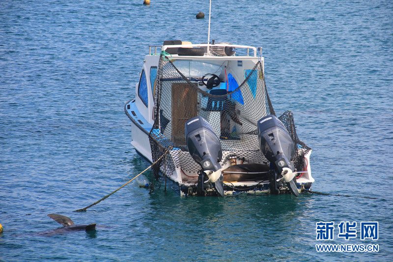 一只海獅在輪船的甲板上休憩,另一只在水中仰泳。