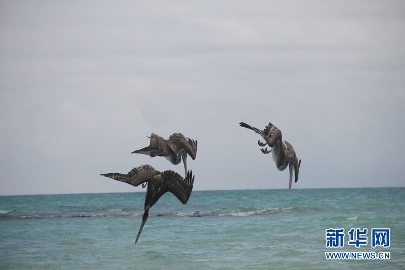數(shù)只鵜鶘在加拉帕戈斯群島中部的圣克魯斯(Santa Cruz)島捕食。