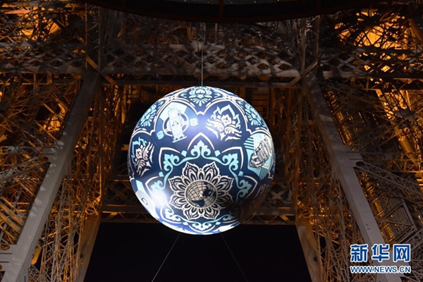 11月23日,在法國(guó)巴黎,一個(gè)名為“地球危機(jī)”的大圓球懸掛在埃菲爾鐵塔上。