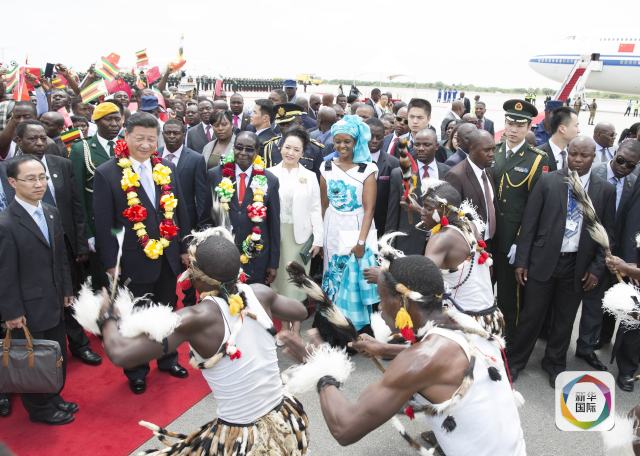 上午10時15分左右,專機降落,習(xí)主席和夫人彭麗媛走下旋梯。奏中津兩國國歌,鳴21響禮炮,檢閱儀仗隊,當(dāng)?shù)貎和I花環(huán)和鮮花……前來迎接的津巴布韋總統(tǒng)穆加貝,為習(xí)主席舉行了隆重的歡迎儀式。