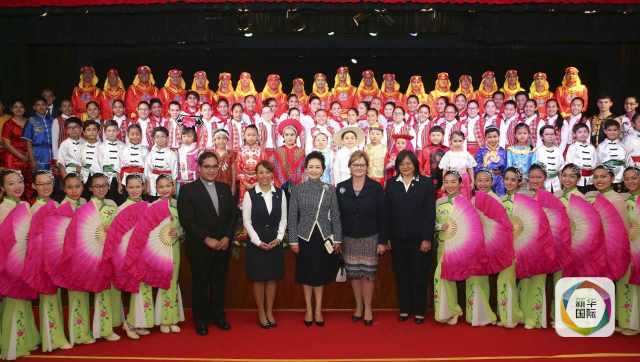 ??? 在學校禮堂,彭麗媛觀看學生文藝演出。學生們表演了合唱《歌聲與微笑》《在希望的田野上》,中秘兒童服裝表演、武術和扇子舞等。演出結束后彭麗媛與全體演員合影,感謝他們的精彩演出。