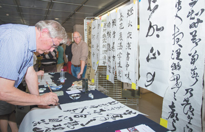 日內瓦大學孔子學院舉辦的中國書法展示活動上,一位當?shù)貪h語愛好者展示書法技藝。