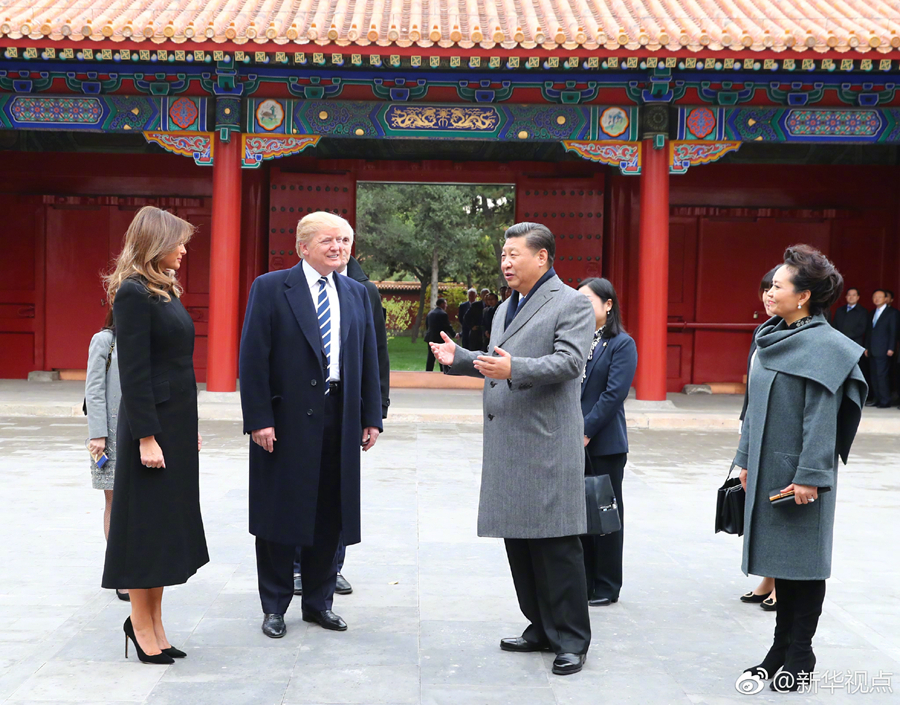 新華網(wǎng)北京11月8日電 國家主席習(xí)近平和夫人彭麗媛8日下午在故宮博物院迎接來華進(jìn)行國事訪問的美國總統(tǒng)特朗普和夫人梅拉尼婭。兩國元首夫婦在寶蘊(yùn)樓簡短茶敘。