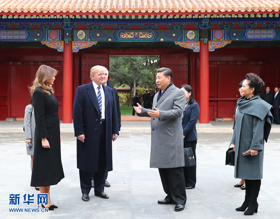 11月8日下午,國家主席習近平和夫人彭麗媛在北京故宮博物院迎接來華進行國事訪問的美國總統(tǒng)特朗普和夫人梅拉尼婭。兩國元首夫婦在寶蘊樓簡短茶敘。新華社記者 謝環(huán)馳 攝