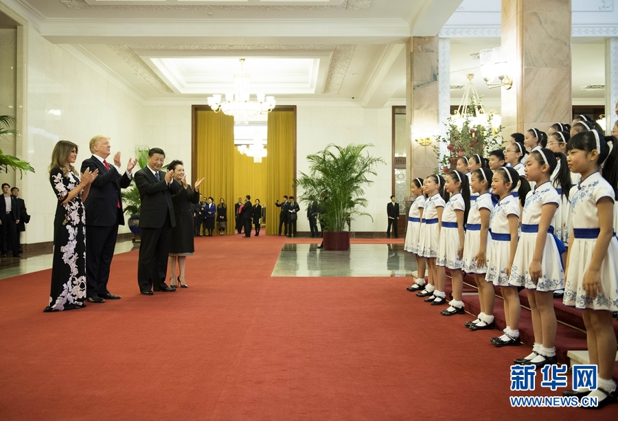 11月9日,國家主席習(xí)近平在北京人民大會(huì)堂東門外廣場(chǎng)舉行歡迎儀式,歡迎美利堅(jiān)合眾國總統(tǒng)唐納德·特朗普對(duì)中國進(jìn)行國事訪問。這是習(xí)近平和夫人彭麗媛同特朗普夫婦在人民大會(huì)堂欣賞文藝表演。新華社記者 李學(xué)仁 攝