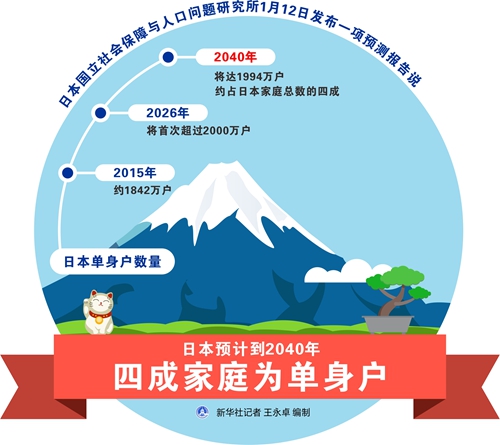 新華社東京1月13日電(記者華義)日本國(guó)立社會(huì)保障與人口問(wèn)題研究所12日發(fā)布一項(xiàng)預(yù)測(cè)報(bào)告說(shuō),到2040年日本單身戶將占日本家庭總數(shù)的約四成。日本老齡化和獨(dú)居現(xiàn)象日益加劇。