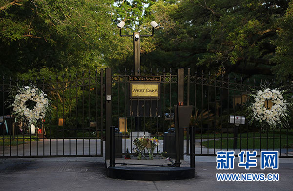 4月18日,鮮花擺放在美國前總統(tǒng)老布什和小布什位于美國休斯敦的住所大門前。新華社發(fā)(李怡今攝)