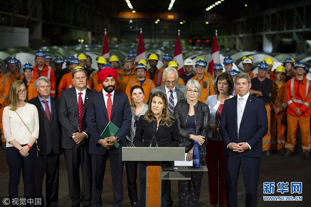 當(dāng)?shù)貢r(shí)間2018年6月29日,加拿大漢密爾頓,加拿大外交部長(zhǎng)弗里蘭、經(jīng)濟(jì)發(fā)展部長(zhǎng)貝恩斯和勞工部長(zhǎng)哈伊杜造訪斯特爾科鋼鐵公司,并共同宣布從7月1日起,加拿大將對(duì)約126億美元從美國(guó)進(jìn)口的商品加征關(guān)稅,以報(bào)復(fù)特朗普政府對(duì)加拿大鋼鋁產(chǎn)品加征關(guān)稅。他們還表示,加拿大政府將向本國(guó)鋼鋁產(chǎn)業(yè)和制造業(yè)提供約15億美元財(cái)政援助。(圖片來源:視覺中國(guó))