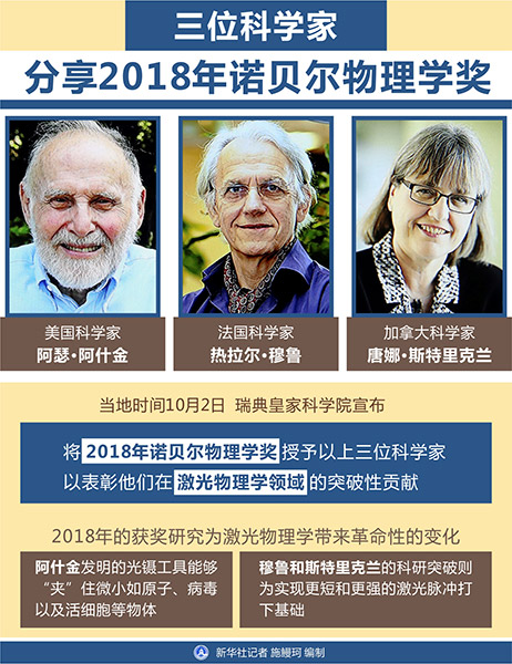 圖表:三位科學(xué)家分享2018年諾貝爾物理學(xué)獎(jiǎng) 新華社記者 施鰻珂 編制