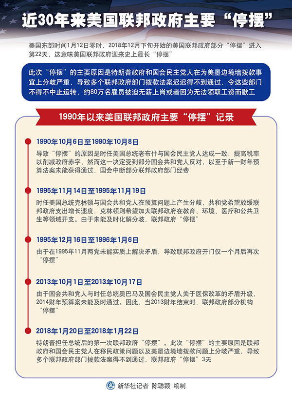 新華社華盛頓1月12日電 新聞背景:近30年來美國聯(lián)邦政府主要“停擺”