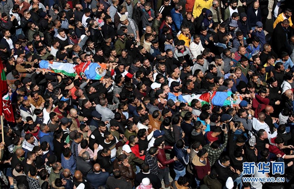 3月20日,在約旦河西岸城市納布盧斯,人們?yōu)楸灰陨胁筷牬蛩赖膬擅屠账固谷伺e行葬禮。 巴勒斯坦方面證實,以色列部隊19日晚在約旦河西岸城市納布盧斯和拉姆安拉附近開槍打死3名巴勒斯坦人。 新華社發(fā)(艾曼·努巴尼攝)